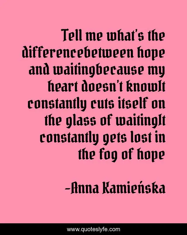 This page presents the quote "Tell me what’s the differencebetween hope and waitingbecause my heart doesn’t knowIt constantly cuts itself on the glass of waitingIt constantly gets lost in the fog of hope". Author of this quote is Anna Kamieńska. This quote is about patience, hope,.