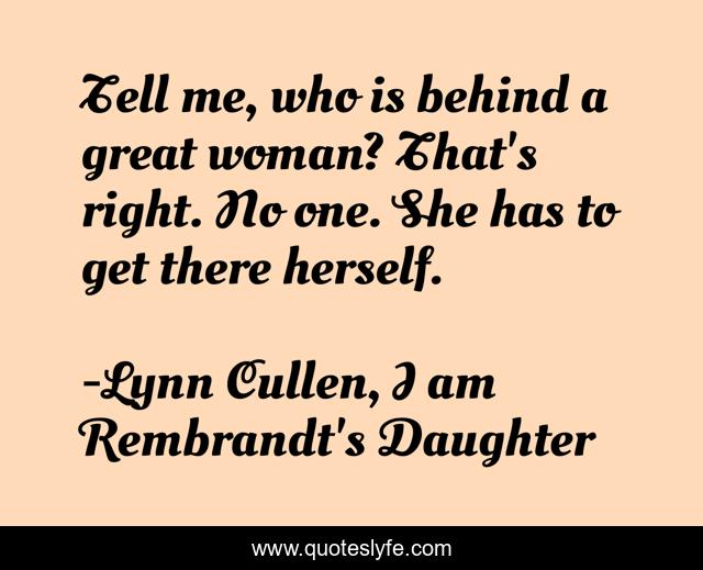 This page presents the quote "Tell me, who is behind a great woman? That's right. No one. She has to get there herself.". Author of this quote is Lynn Cullen, I am Rembrandt's Daughter. This quote is about girl-power, feminism,.