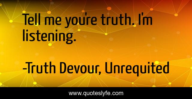 This page presents the quote "Tell me you're truth. I'm listening.". Author of this quote is Truth Devour, Unrequited. This quote is about faith, love, kindred-spirits, joy, karmic, soul, romance, twin-flames, sated,.