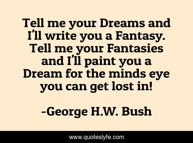 This page presents the quote "Tell me your Dreams and I'll write you a Fantasy. Tell me your Fantasies and I'll paint you a Dream for the minds eye you can get lost in!". Author of this quote is George H.W. Bush. .