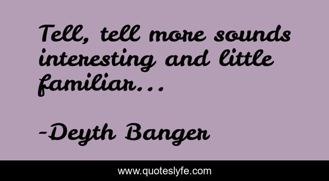 This page presents the quote "Tell, tell more sounds interesting and little familiar...". Author of this quote is Deyth Banger. This quote is about interesting, sounds, story, more,.