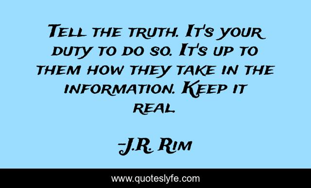 This page presents the quote "Tell the truth. It's your duty to do so. It's up to them how they take in the information. Keep it real.". Author of this quote is J.R. Rim. This quote is about duty, reveal, genuine, telling-the-truth, simple-life, honest, authenticity, keep-it-real, reality,.