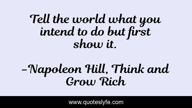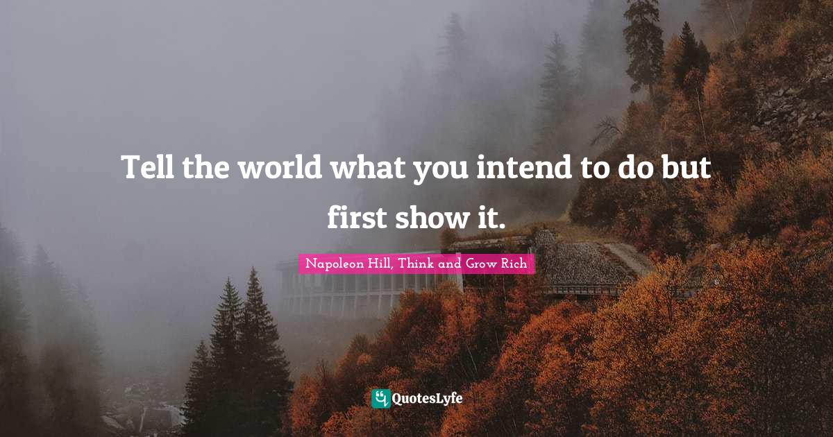This page presents the quote "Tell the world what you intend to do but first show it.". Author of this quote is Napoleon Hill, Think and Grow Rich. This quote is about ambition, determination, goals, success, self-help,.