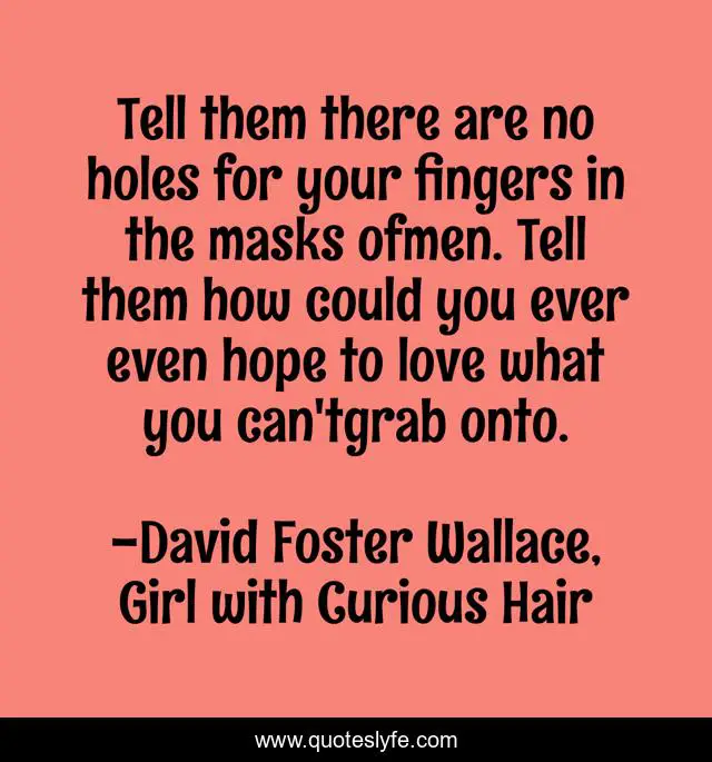 This page presents the quote "Tell them there are no holes for your fingers in the masks ofmen. Tell them how could you ever even hope to love what you can'tgrab onto.". Author of this quote is David Foster Wallace, Girl with Curious Hair. This quote is about relationships, love, affection,.