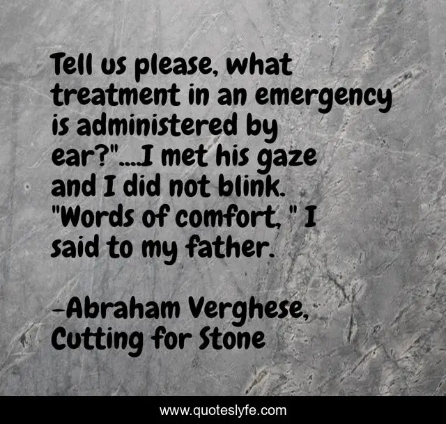 This page presents the quote "Tell us please, what treatment in an emergency is administered by ear?"....I met his gaze and I did not blink. "Words of comfort, " I said to my father.". Author of this quote is Abraham Verghese, Cutting for Stone. This quote is about medicine, comfort, healing, doctor,.