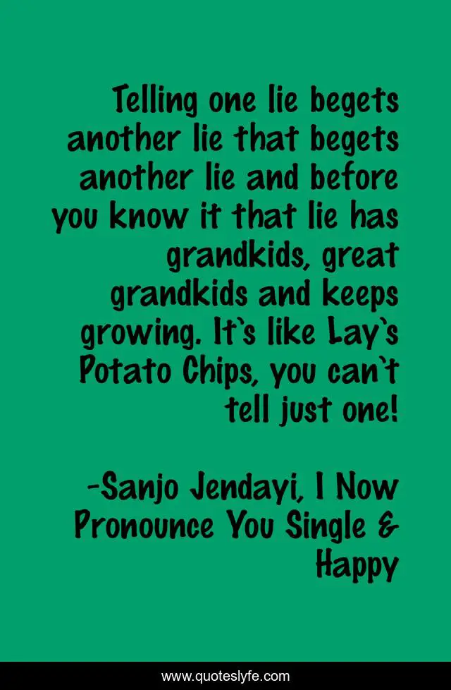 This page presents the quote "Telling one lie begets another lie that begets another lie and before you know it that lie has grandkids, great grandkids and keeps growing. It’s like Lay’s Potato Chips, you can’t tell just one!". Author of this quote is Sanjo Jendayi, I Now Pronounce You Single & Happy. This quote is about lies, lay-s-potato-chips, untruths,.