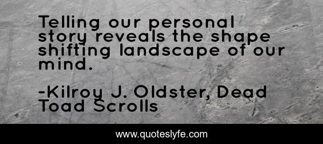 This page presents the quote "Telling our personal story reveals the shape shifting landscape of our mind.". Author of this quote is Kilroy J. Oldster, Dead Toad Scrolls. This quote is about autobiography, story-of-my-life, memoir, storytelling, writing,.