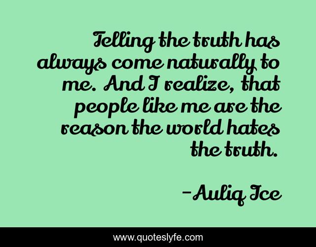 This page presents the quote "Telling the truth has always come naturally to me. And I realize, that people like me are the reason the world hates the truth.". Author of this quote is Auliq Ice. This quote is about telling-the-truth, telling-truth, truth, hatred, truth-of-life, auliq-ice,.