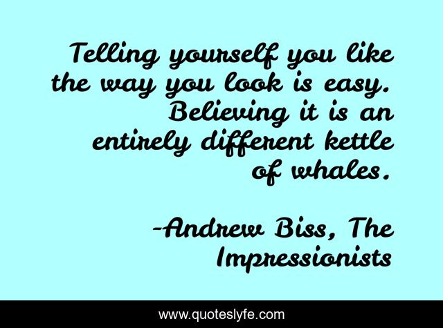 This page presents the quote "Telling yourself you like the way you look is easy. Believing it is an entirely different kettle of whales.". Author of this quote is Andrew Biss, The Impressionists. This quote is about body-image, self-image, self-esteem,.