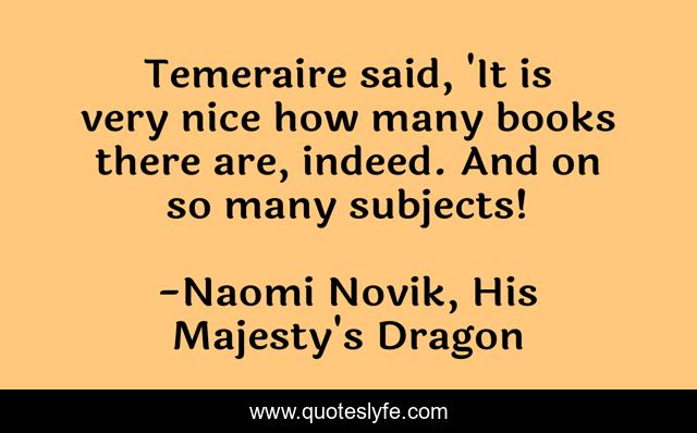This page presents the quote "Temeraire said, 'It is very nice how many books there are, indeed. And on so many subjects!". Author of this quote is Naomi Novik, His Majesty's Dragon. This quote is about temeraire, books, reading,.