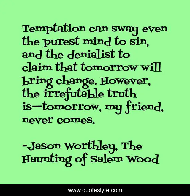This page presents the quote "Temptation can sway even the purest mind to sin, and the denialist to claim that tomorrow will bring change. However, the irrefutable truth is—tomorrow, my friend, never comes.". Author of this quote is Jason Worthley, The Haunting of Salem Wood. This quote is about addiction, temptation,.