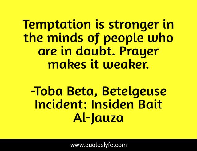 This page presents the quote "Temptation is stronger in the minds of people who are in doubt. Prayer makes it weaker.". Author of this quote is Toba Beta, Betelgeuse Incident: Insiden Bait Al-Jauza. This quote is about life, temptation, stronger, mind, secret, doubt, prayer, strong,.