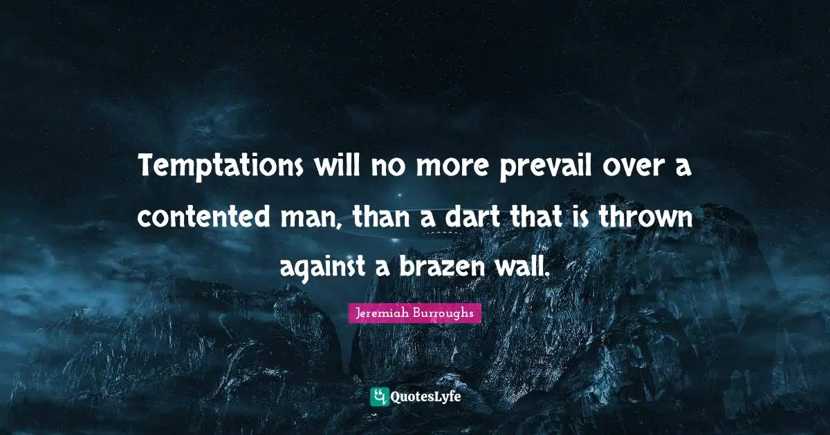 This page presents the quote "Temptations will no more prevail over a contented man, than a dart that is thrown against a brazen wall.". Author of this quote is Jeremiah Burroughs. This quote is about thrown, men, temptation, brazen, wall,.