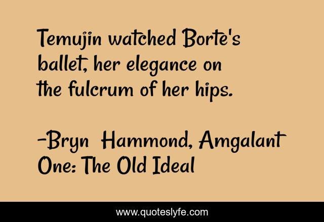 This page presents the quote "Temujin watched Borte's ballet, her elegance on the fulcrum of her hips.". Author of this quote is Bryn Hammond, Amgalant One: The Old Ideal. This quote is about dance, love, hips, affection, elegance,.