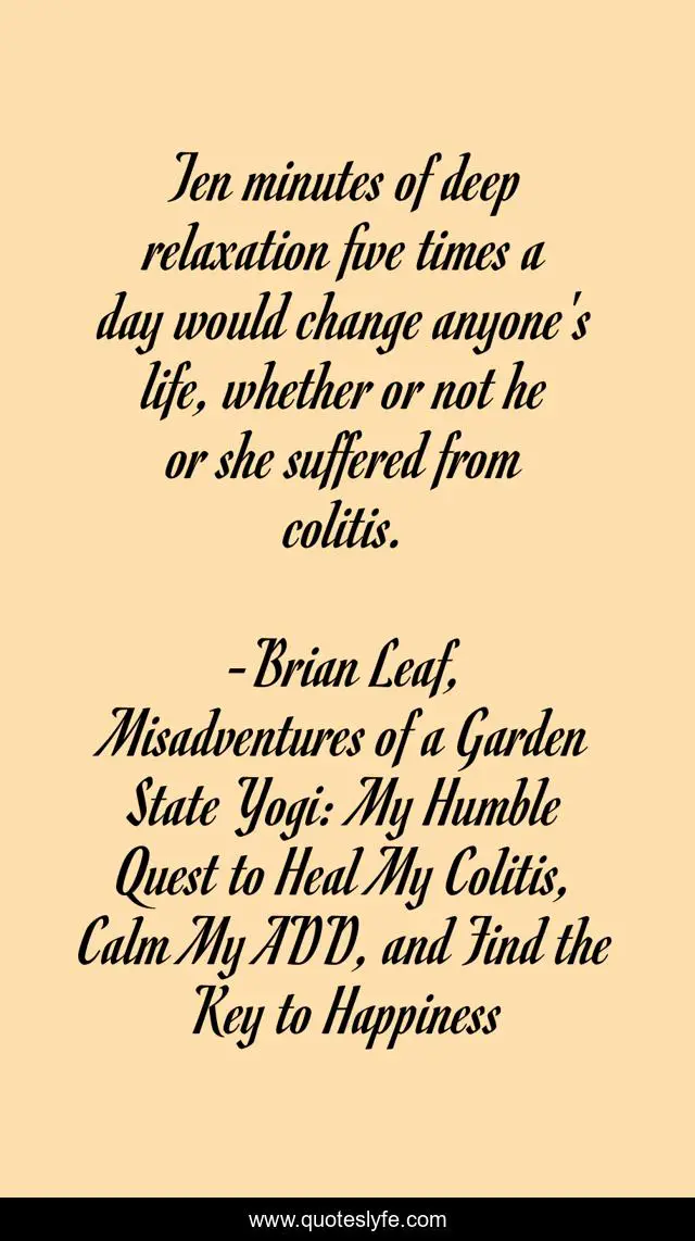 This page presents the quote "Ten minutes of deep relaxation five times a day would change anyone's life, whether or not he or she suffered from colitis.". Author of this quote is Brian Leaf, Misadventures of a Garden State Yogi: My Humble Quest to Heal My Colitis, Calm My ADD, and Find the Key to Happiness. .
