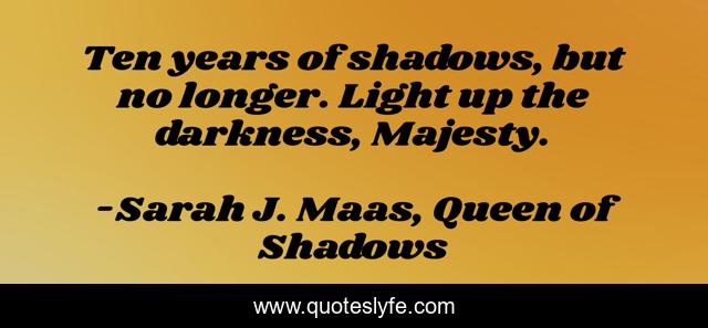 This page presents the quote "Ten years of shadows, but no longer. Light up the darkness, Majesty.". Author of this quote is Sarah J. Maas, Queen of Shadows. This quote is about shadows, terrasen, aelin-ashryver-galathynius, court, darkness, majesty, light-up, aedion-ashryver, queen-of-terrasen,.