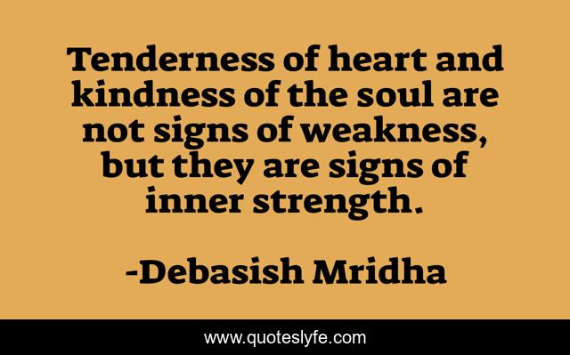 This page presents the quote "Tenderness of heart and kindness of the soul are not signs of weakness, but they are signs of inner strength.". Author of this quote is Debasish Mridha. This quote is about kindness-of-soul, philosophy, debasish-mridha, quotes, debasish-mridha-md, inspirational, signs-of-weakness, inner-strength, enthusiasm,.