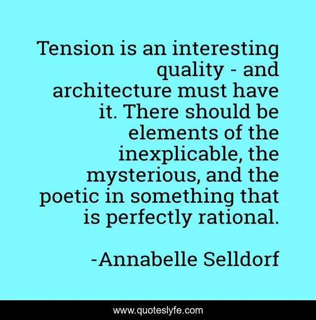 This page presents the quote "Tension is an interesting quality - and architecture must have it. There should be elements of the inexplicable, the mysterious, and the poetic in something that is perfectly rational.". Author of this quote is Annabelle Selldorf. This quote is about mysterious, quality,.