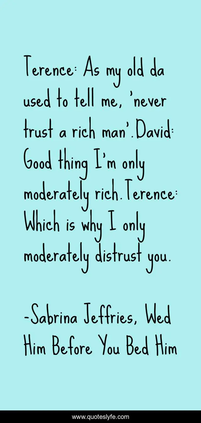 This page presents the quote "Terence: As my old da used to tell me, 'never trust a rich man'.David: Good thing I'm only moderately rich.Terence: Which is why I only moderately distrust you.". Author of this quote is Sabrina Jeffries, Wed Him Before You Bed Him. This quote is about romance, humor, wealth,.