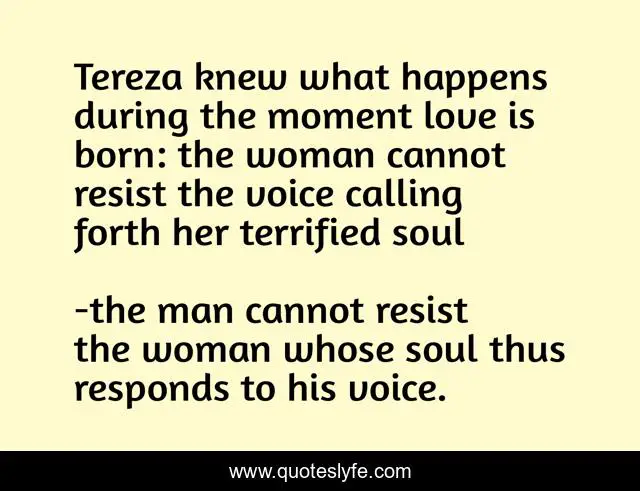 This page presents the quote "Tereza knew what happens during the moment love is born: the woman cannot resist the voice calling forth her terrified soul". Author of this quote is the man cannot resist the woman whose soul thus responds to his voice.. This quote is about the unbearable lightness of being, milan kundera,.