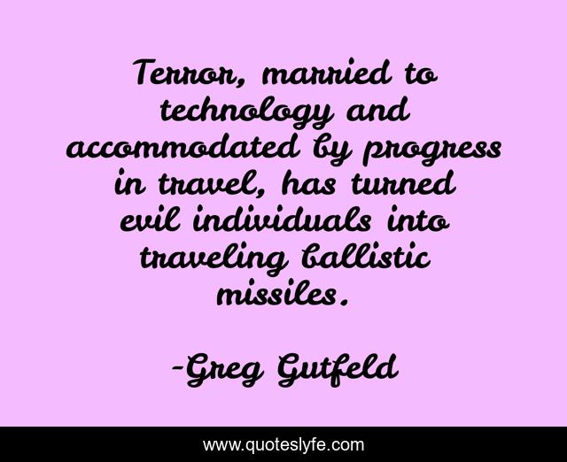 This page presents the quote "Terror, married to technology and accommodated by progress in travel, has turned evil individuals into traveling ballistic missiles.". Author of this quote is Greg Gutfeld. This quote is about progress, technology, evil,.