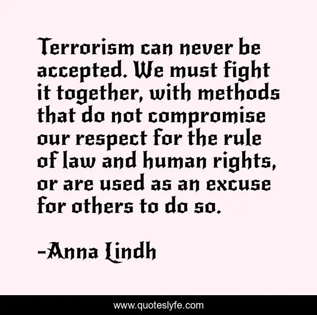 This page presents the quote "Terrorism can never be accepted. We must fight it together, with methods that do not compromise our respect for the rule of law and human rights, or are used as an excuse for others to do so.". Author of this quote is Anna Lindh. This quote is about law, together, fight,.