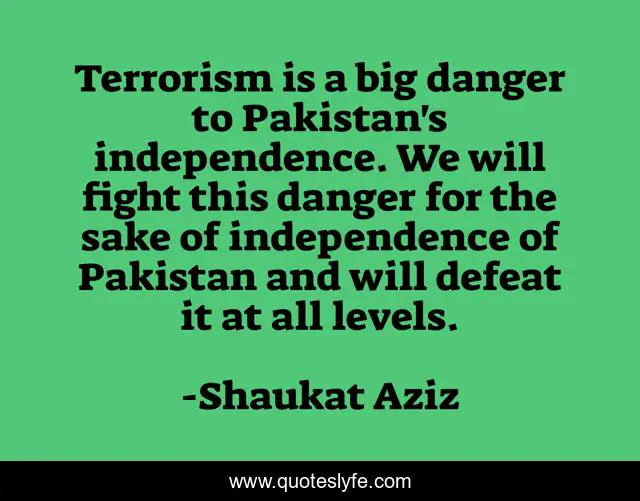 This page presents the quote "Terrorism is a big danger to Pakistan's independence. We will fight this danger for the sake of independence of Pakistan and will defeat it at all levels.". Author of this quote is Shaukat Aziz. This quote is about terrorism, fight, defeat,.