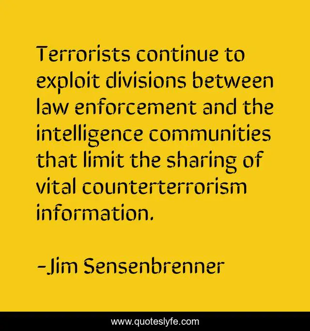 This page presents the quote "Terrorists continue to exploit divisions between law enforcement and the intelligence communities that limit the sharing of vital counterterrorism information.". Author of this quote is Jim Sensenbrenner. This quote is about information, sharing, law,.