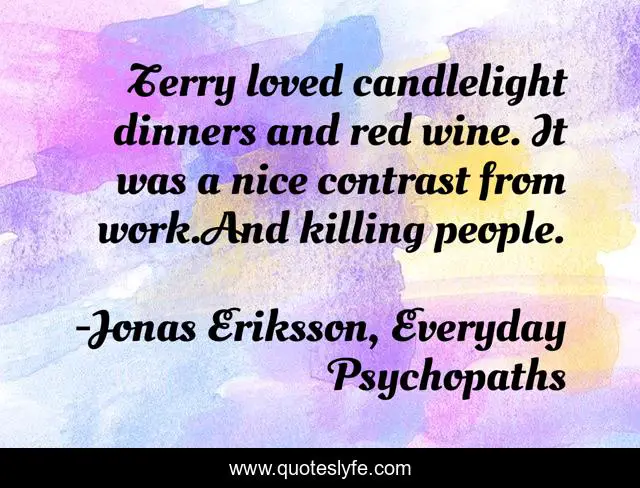 This page presents the quote "Terry loved candlelight dinners and red wine. It was a nice contrast from work.And killing people.". Author of this quote is Jonas Eriksson, Everyday Psychopaths. This quote is about horror, psychopath, dark-humor, thriller,.
