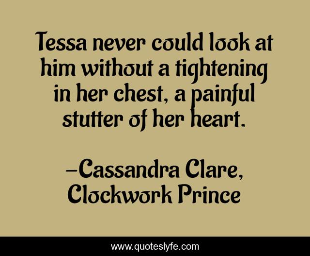 This page presents the quote "Tessa never could look at him without a tightening in her chest, a painful stutter of her heart.". Author of this quote is Cassandra Clare, Clockwork Prince. This quote is about love, tessa-gray, sad, heartbroken, wessa, will-herondale, affection,.