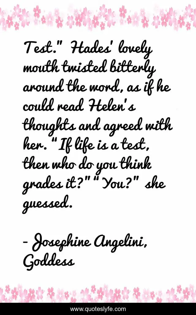 This page presents the quote "Test.” Hades’ lovely mouth twisted bitterly around the word, as if he could read Helen’s thoughts and agreed with her. “If life is a test, then who do you think grades it?”“You?” she guessed.". Author of this quote is Josephine Angelini, Goddess. This quote is about test, afterlife, goddess, life,.
