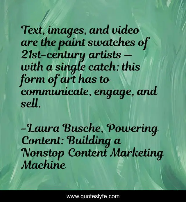 This page presents the quote "Text, images, and video are the paint swatches of 21st-century artists — with a single catch: this form of art has to communicate, engage, and sell.". Author of this quote is Laura Busche, Powering Content: Building a Nonstop Content Marketing Machine. This quote is about branding, content-marketing, entrepreneurship, blogging, marketing,.