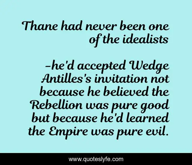 "he'd accepted Wedge Antilles's invitation not because he believed the Rebellion was pure good but because he'd learned the Empire was pure evil. Quotes." Quoteslyfe.com, 2025. Fri. 05 Dec. 2025. <https://www.quoteslyfe.com/quote/Thane-had-never-been-one-of-the-57318>.