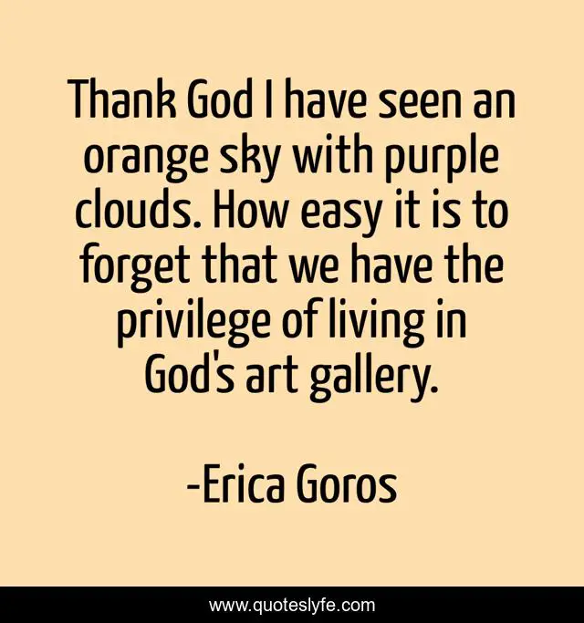 This page presents the quote "Thank God I have seen an orange sky with purple clouds. How easy it is to forget that we have the privilege of living in God's art gallery.". Author of this quote is Erica Goros. This quote is about gratitude, love, beauty, nature, god, awe, affection, inspiration,.