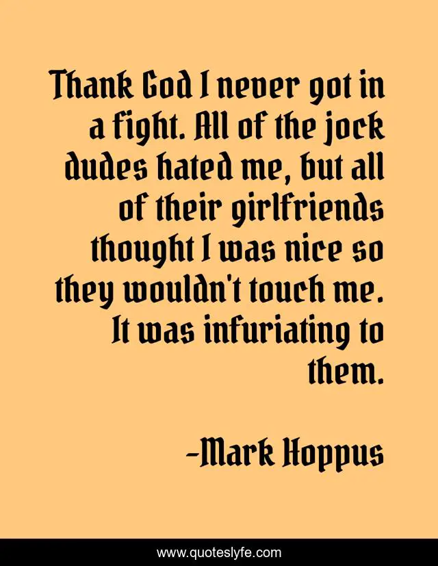 This page presents the quote "Thank God I never got in a fight. All of the jock dudes hated me, but all of their girlfriends thought I was nice so they wouldn't touch me. It was infuriating to them.". Author of this quote is Mark Hoppus. This quote is about me, god, thank god,.