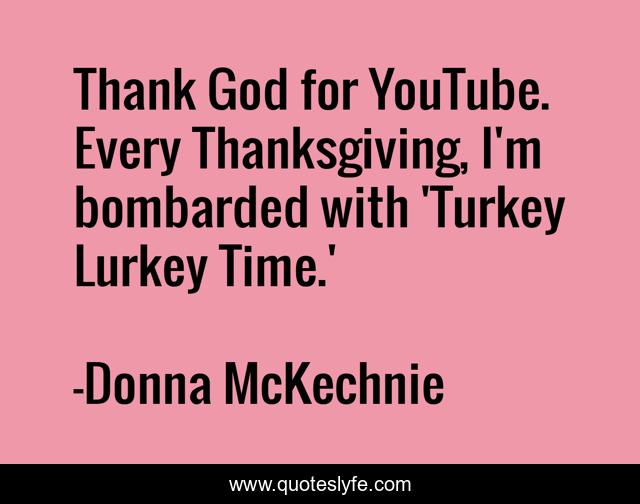 This page presents the quote "Thank God for YouTube. Every Thanksgiving, I'm bombarded with 'Turkey Lurkey Time.'". Author of this quote is Donna McKechnie. This quote is about god, thank god, time,.