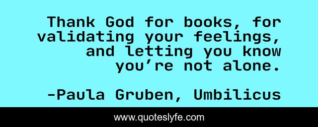 This page presents the quote "Thank God for books, for validating your feelings, and letting you know you’re not alone.". Author of this quote is Paula Gruben, Umbilicus. This quote is about validate, books, reading, validation,.