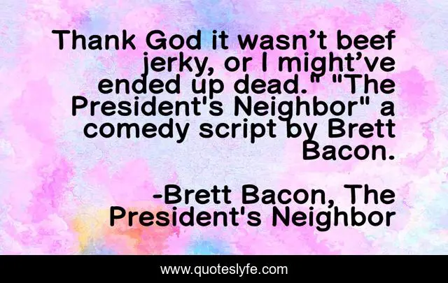 This page presents the quote "Thank God it wasn’t beef jerky, or I might’ve ended up dead." "The President's Neighbor" a comedy script by Brett Bacon.". Author of this quote is Brett Bacon, The President's Neighbor. This quote is about humorous, comedy,.