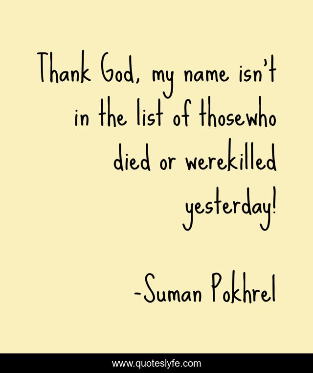 This page presents the quote "Thank God, my name isn’t in the list of thosewho died or werekilled yesterday!". Author of this quote is Suman Pokhrel. This quote is about terror, death,.