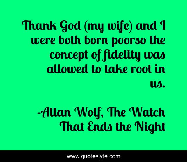 This page presents the quote "Thank God (my wife) and I were both born poorso the concept of fidelity was allowed to take root in us.". Author of this quote is Allan Wolf, The Watch That Ends the Night. This quote is about poor, cheating, humor, marriage, fidelity, spirit,.