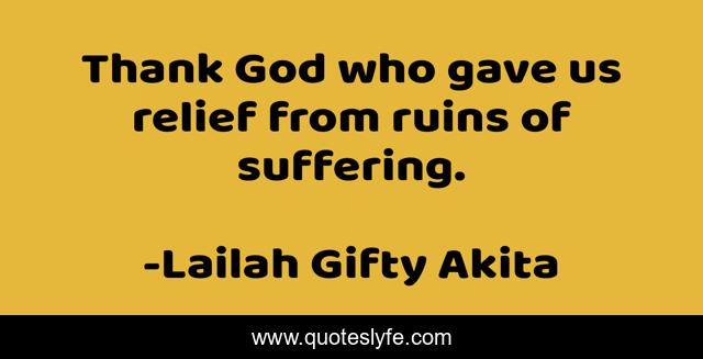This page presents the quote "Thank God who gave us relief from ruins of suffering.". Author of this quote is Lailah Gifty Akita. This quote is about relieved, god, suffering, ruins, thankful,.