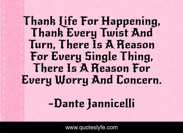 This page presents the quote "Thank Life For Happening, Thank Every Twist And Turn, There Is A Reason For Every Single Thing, There Is A Reason For Every Worry And Concern.". Author of this quote is Dante Jannicelli. This quote is about life, everything-is-good, everything-happens-for-a-reason, everything, inspirational, changes-in-life, positive-thoughts, enthusiasm, trying-your-hardest,.