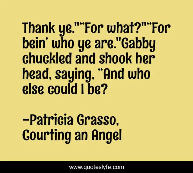 This page presents the quote "Thank ye."“For what?"“For bein’ who ye are."Gabby chuckled and shook her head, saying, “And who else could I be?". Author of this quote is Patricia Grasso, Courting an Angel. This quote is about friendship, thanks,.
