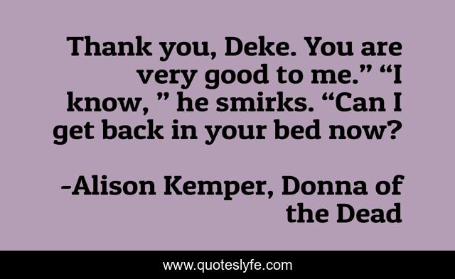 This page presents the quote "Thank you, Deke. You are very good to me.” “I know, ” he smirks. “Can I get back in your bed now?". Author of this quote is Alison Kemper, Donna of the Dead. This quote is about ya, humor, zombies, zombie-apocalypse,.