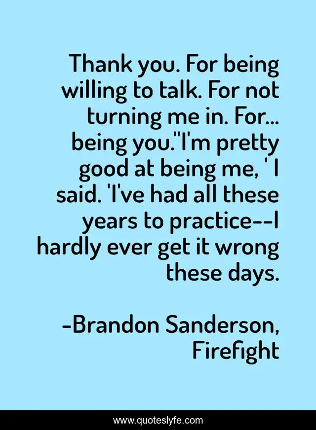 "Brandon Sanderson, Firefight Quotes." Quoteslyfe.com, 2025. Fri. 05 Dec. 2025. <https://www.quoteslyfe.com/quote/Thank-you-For-being-willing-to-talk-180300>.