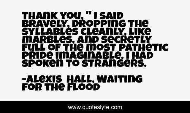 This page presents the quote "Thank you, " I said bravely, dropping the syllables cleanly, like marbles, and secretly full of the most pathetic pride imaginable. I had spoken to strangers.". Author of this quote is Alexis Hall, Waiting for the Flood. This quote is about strangers, syllables, brave, marbles, stuttering,.