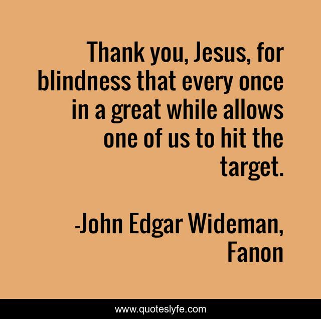 This page presents the quote "Thank you, Jesus, for blindness that every once in a great while allows one of us to hit the target.". Author of this quote is John Edgar Wideman, Fanon. This quote is about gratitude, existentialism, jesus,.