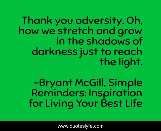 This page presents the quote "Thank you adversity. Oh, how we stretch and grow in the shadows of darkness just to reach the light.". Author of this quote is Bryant McGill, Simple Reminders: Inspiration for Living Your Best Life. This quote is about shadows, darkness, light, stretching, growth, adversity,.