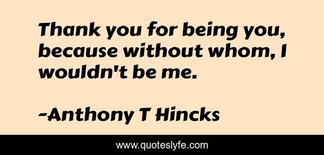 This page presents the quote "Thank you for being you, because without whom, I wouldn't be me.". Author of this quote is Anthony T Hincks. This quote is about me, life, love, being, philosophy, whom, without, affection,.