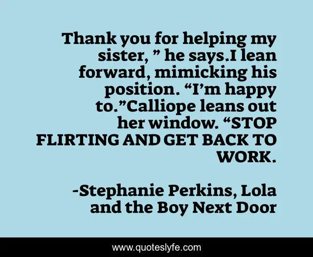 This page presents the quote "Thank you for helping my sister, ” he says.I lean forward, mimicking his position. “I’m happy to.”Calliope leans out her window. “STOP FLIRTING AND GET BACK TO WORK.". Author of this quote is Stephanie Perkins, Lola and the Boy Next Door. This quote is about funny, cricket, lola-and-the-boy-next-door, lola, flirt, window, stephanie-perkins, calliope, comedy,.